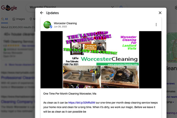 This impressive Google business listing highlights all of the things we do well like one-time or scheduled cleaning appointments; trash removal; free estimates; and especially our COVID cleaning and disinfecting routines.